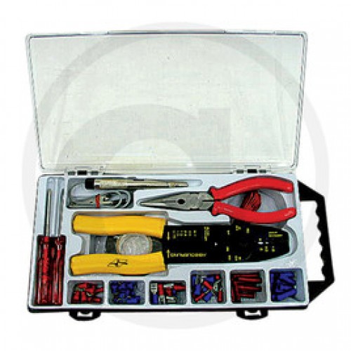 60 spojki za kablove, 1 univerzalna klešta za električare, špric klešta, 2 odvrtača, probna lampa 6-24V s akablom dužine 1m, 1 izolir traka